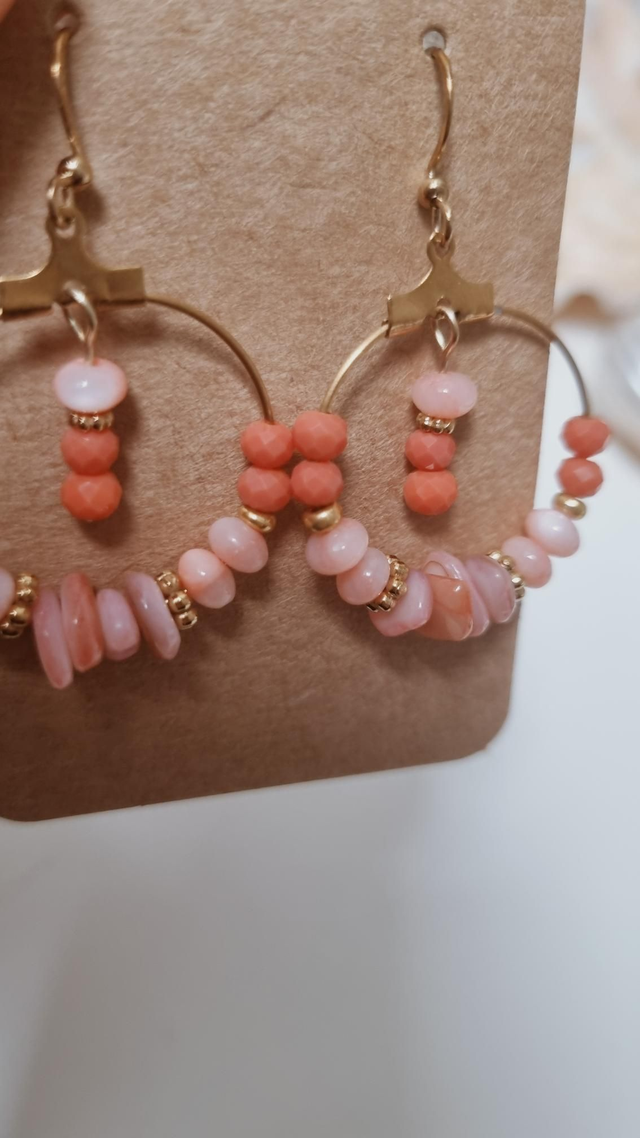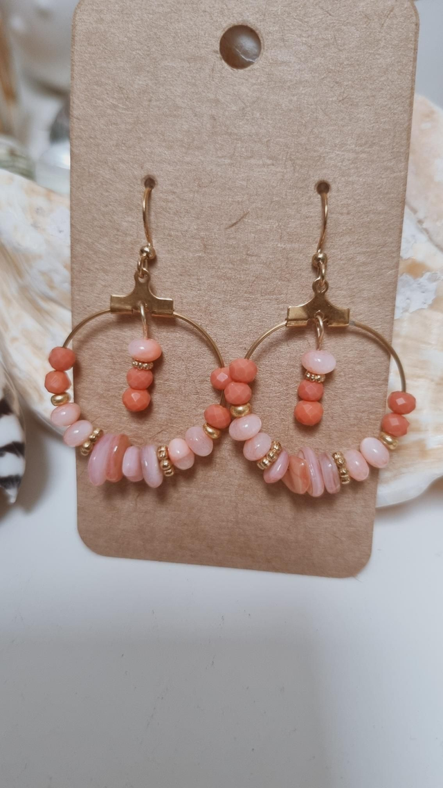 Cette paire est composée de perles facettées en verre et de fragments de coquillages teintés.