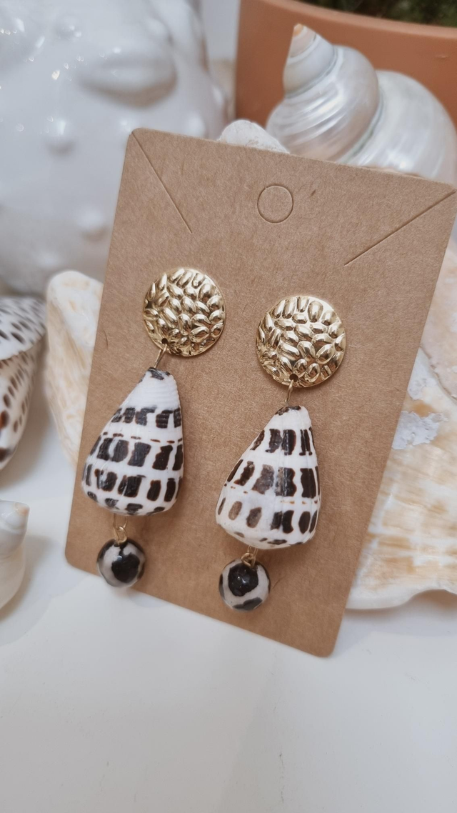 Cette paire est composée de coquillages conus et de pierre (Agathe tibetaine) .