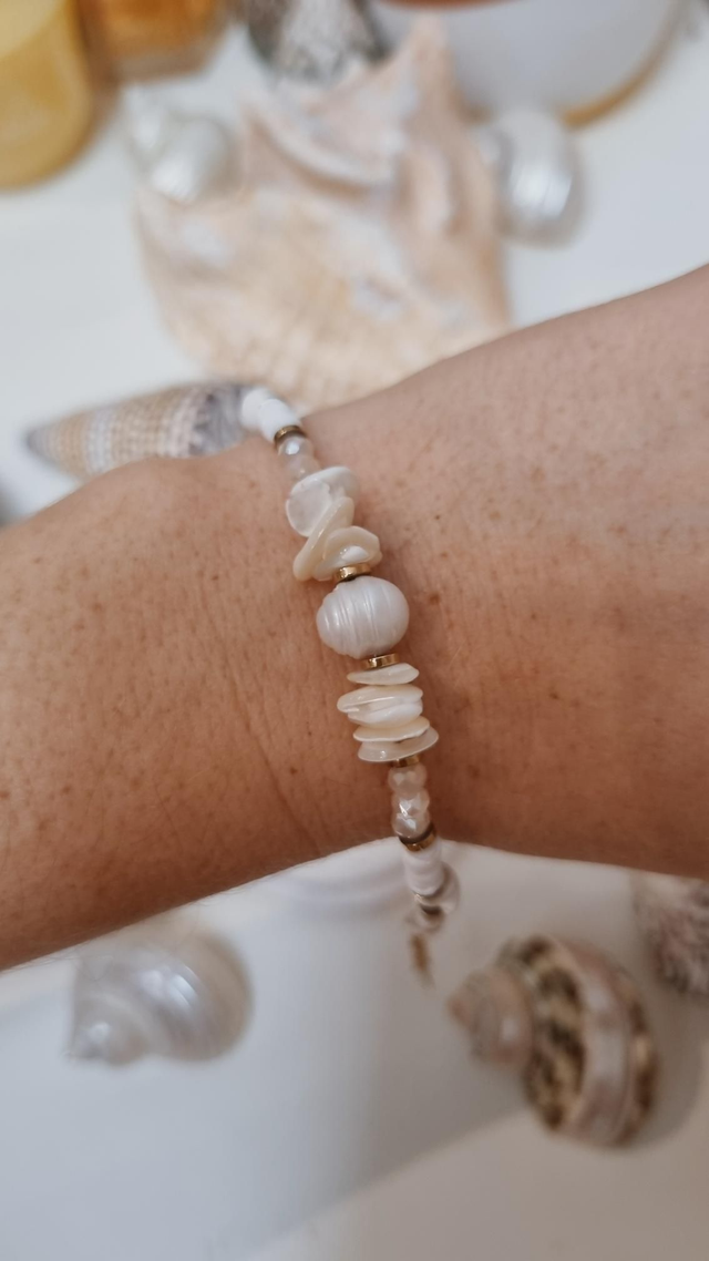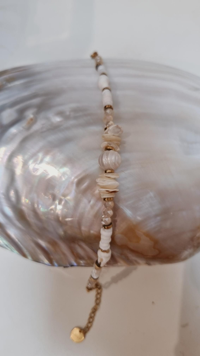 Ce collier est composé de perles d'eau douce, coquillages et perles facettées en verre.