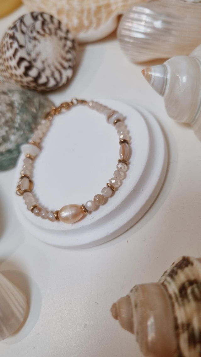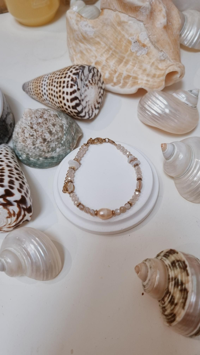 Ce collier est composé de perles d'eau douce, coquillages et perles facettées en verre.