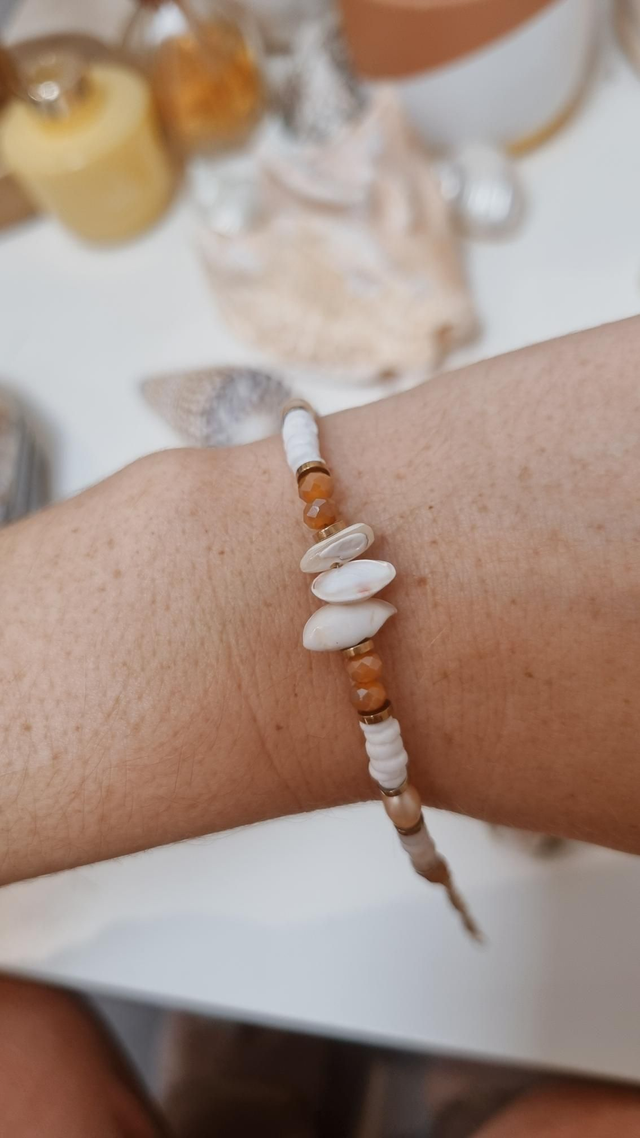 Ce collier est composé de perles d'eau douce, coquillages et perles facettées en verre.