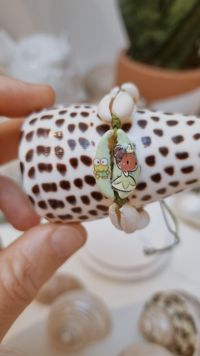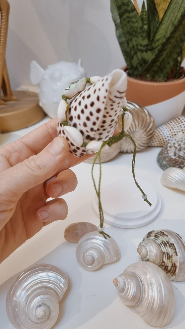 Chaque bracelet est composé de sept coquillages cauris, dont un coquillage central décoré.