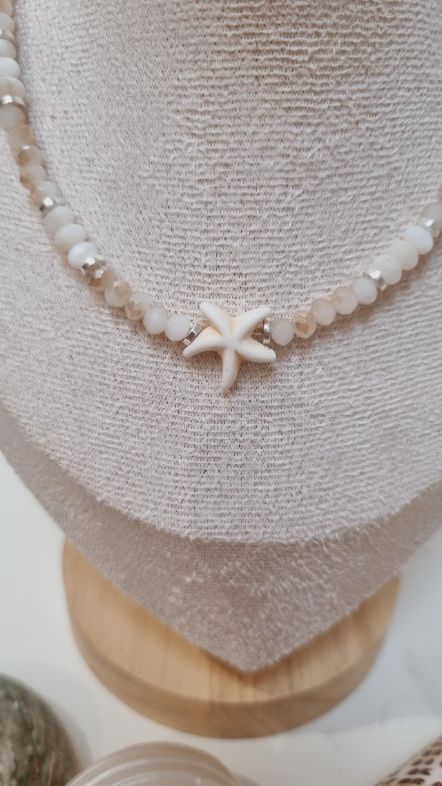 Ce collier est composé de perles facettées en verre et de fragments de coquillages.