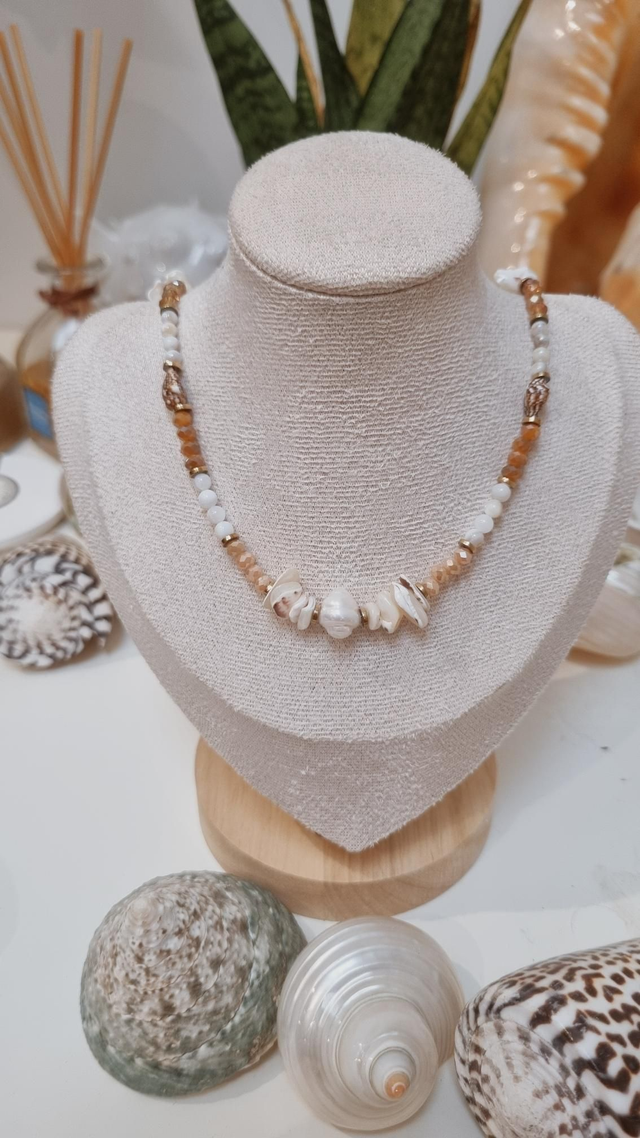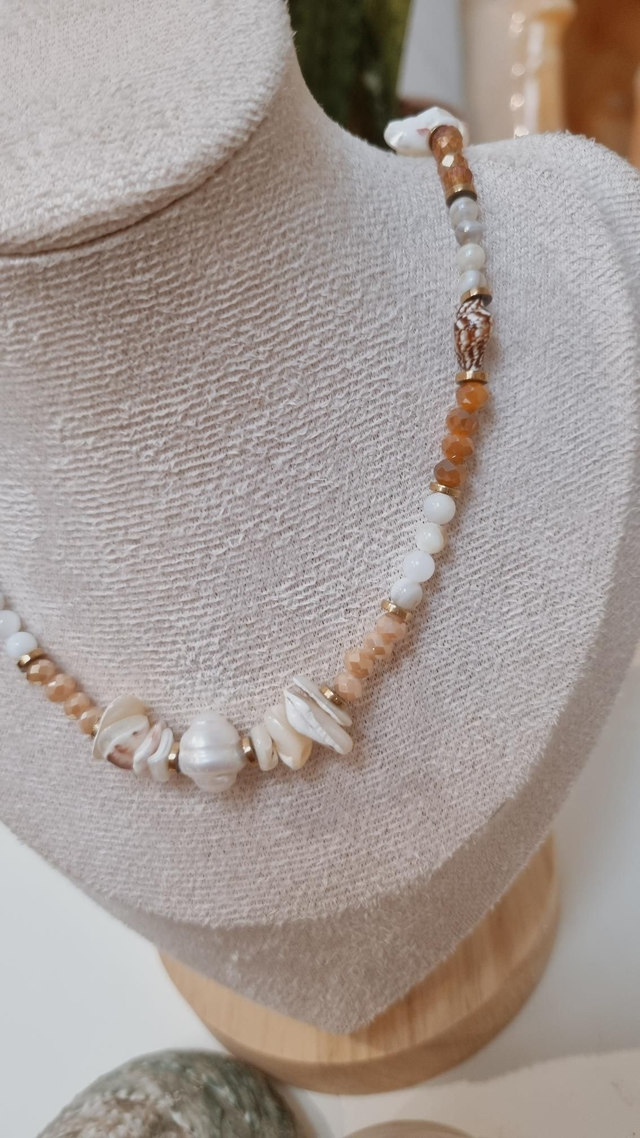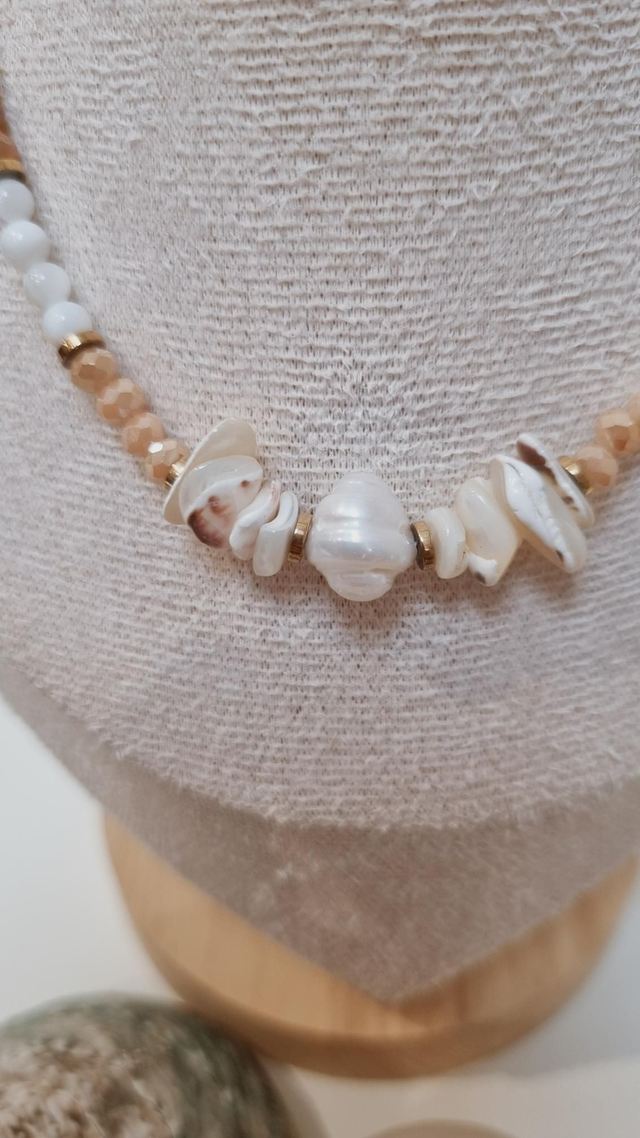 Ce collier est composé de perles d'eau douce, perles facettées en verre et fragments de coquillages.