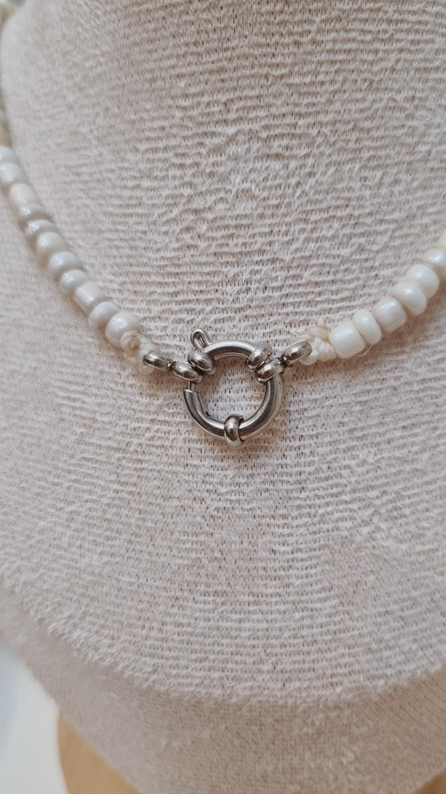 Composé de perles aux nuances ivoire, crème, beige et blanc cassé, pour un rendu doux et lumineux.