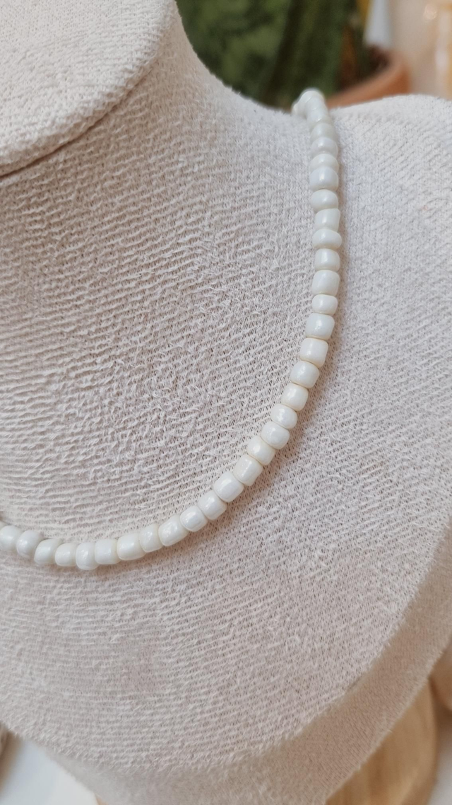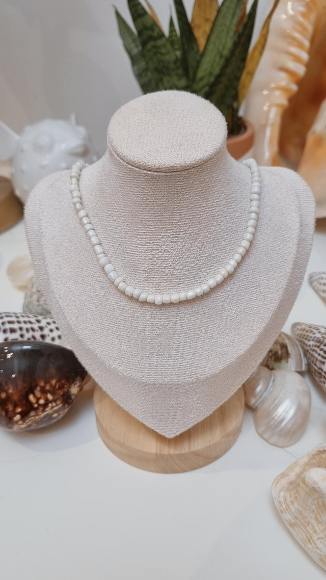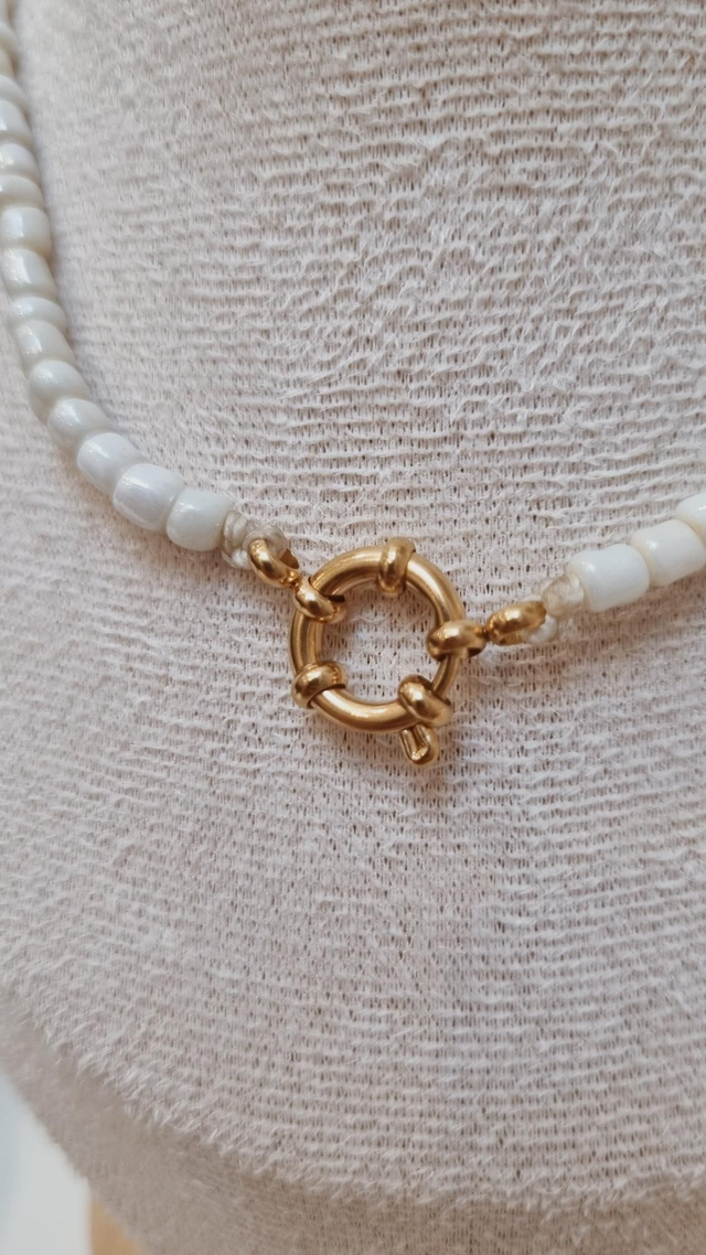 Composé de perles aux nuances ivoire, crème, beige et blanc cassé, pour un rendu doux et lumineux.