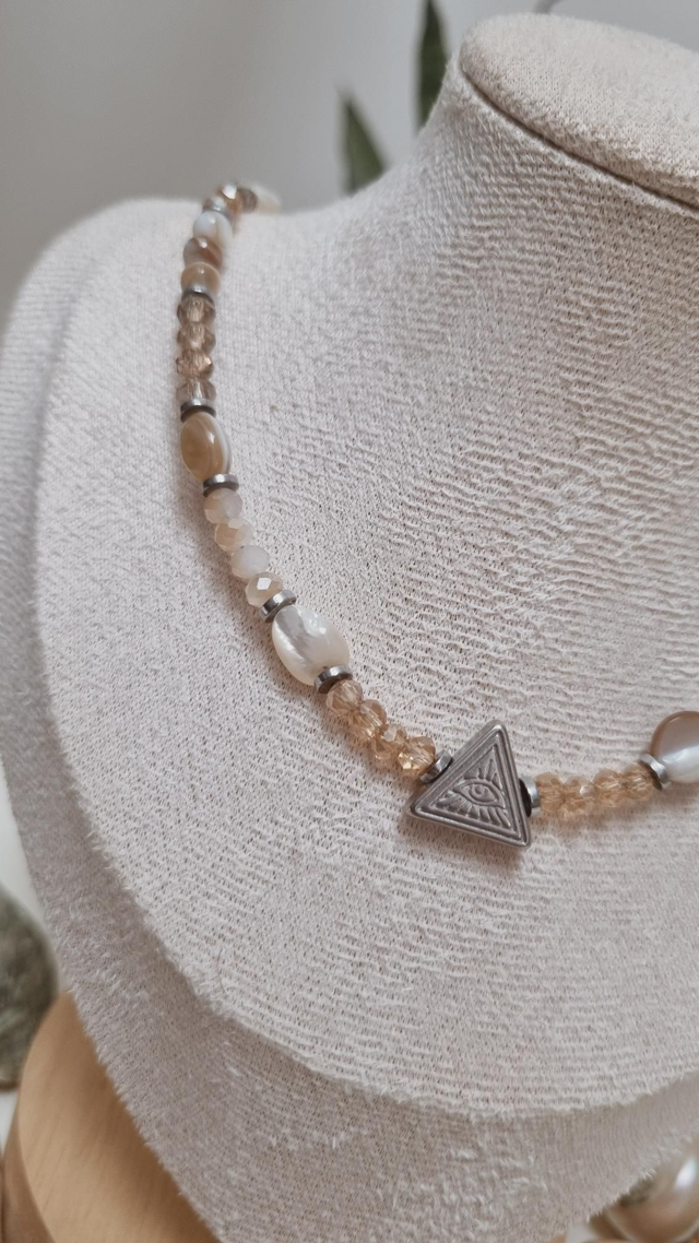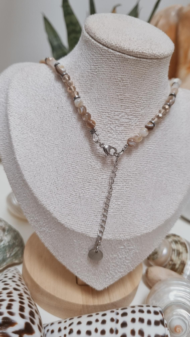 Ce collier est composé de perles facettées en verre et de fragments de coquillages.