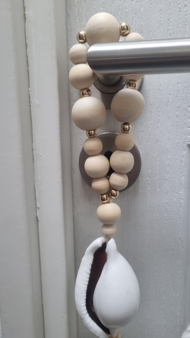 Composée de perles en bois naturel, de perles dorées, d’un coquillage ovula et d’un pompon beige crème.