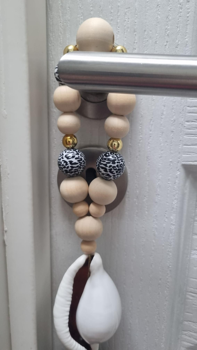 Composée de perles en bois naturel, de perles léopards, de perles dorées, d’un coquillage ovula blanc naturel et d’un pompon noir en coton.