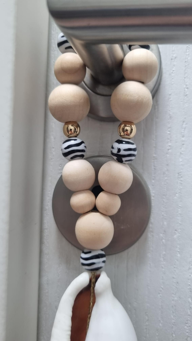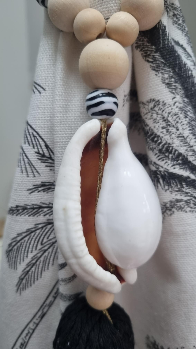 Composée de perles en bois naturel, de perles en plastiques zèbres, de perles en fer doré, d’un coquillage ovula blanc et d’un pompon noir en coton.