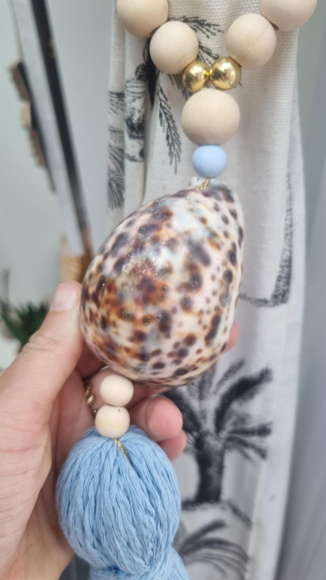 Composée de perles en bois naturel, de perles en silicone bleues, de perles dorées, d’un coquillage cypraea tigris et d’un pompon bleu en coton.