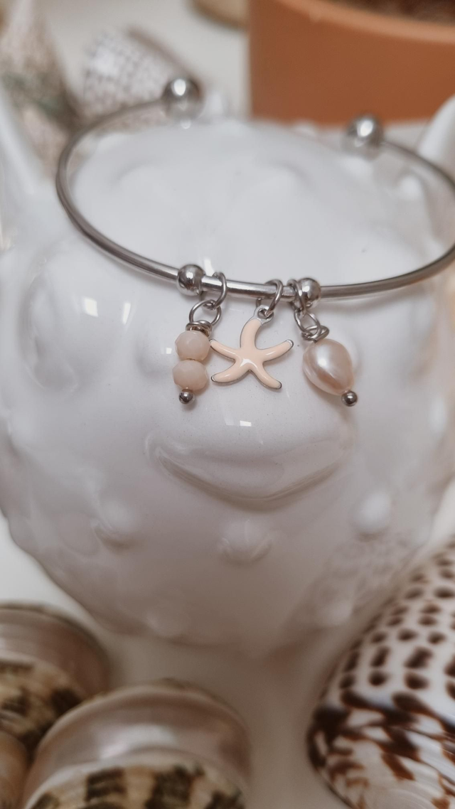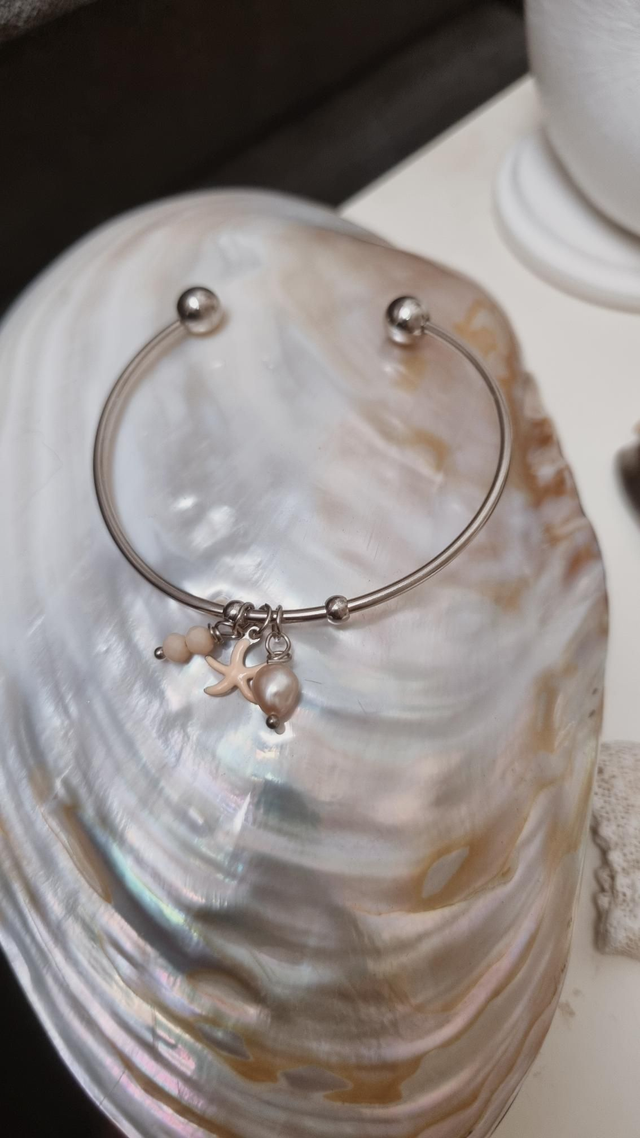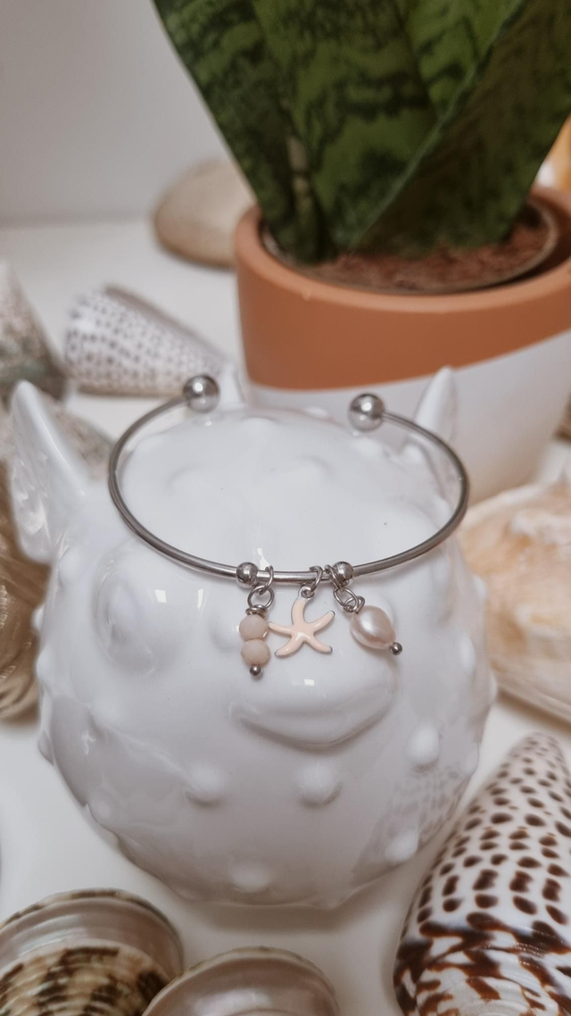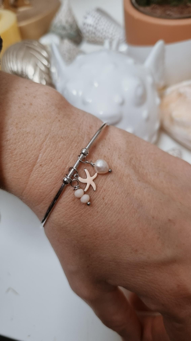 Jonc acier argenté - étoile de mer rose