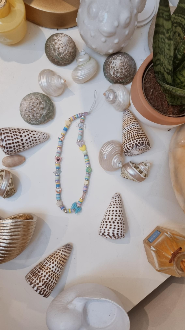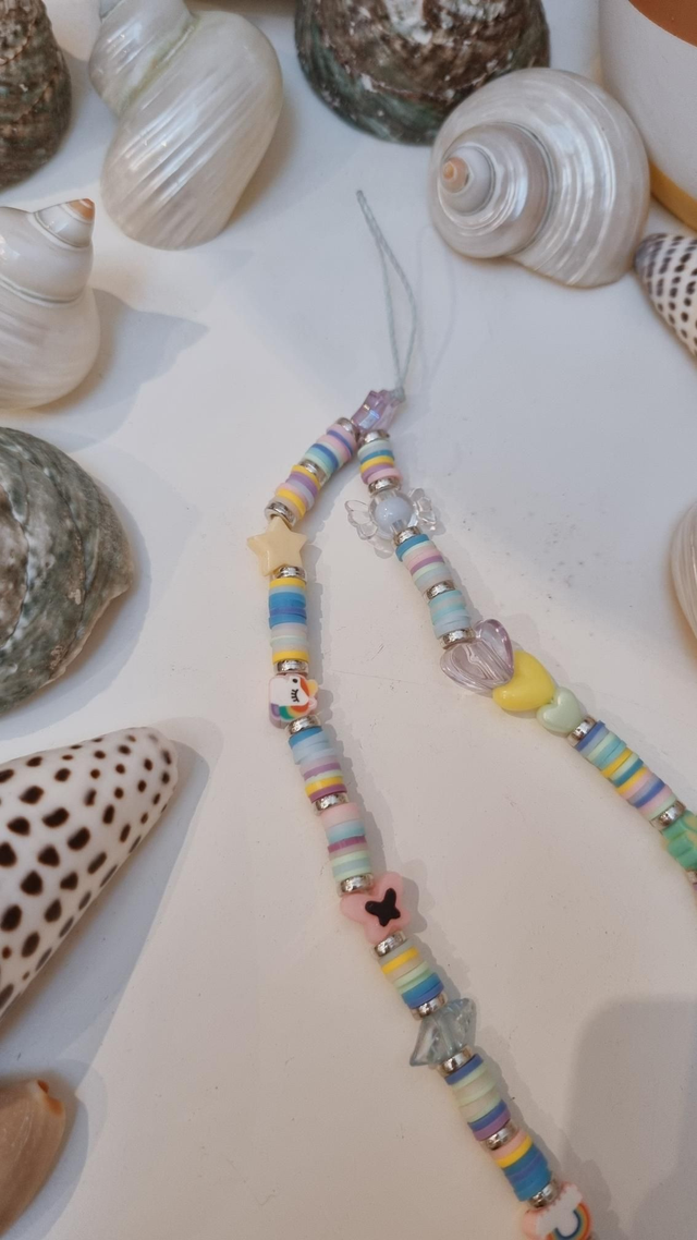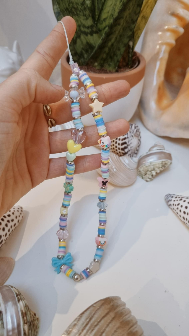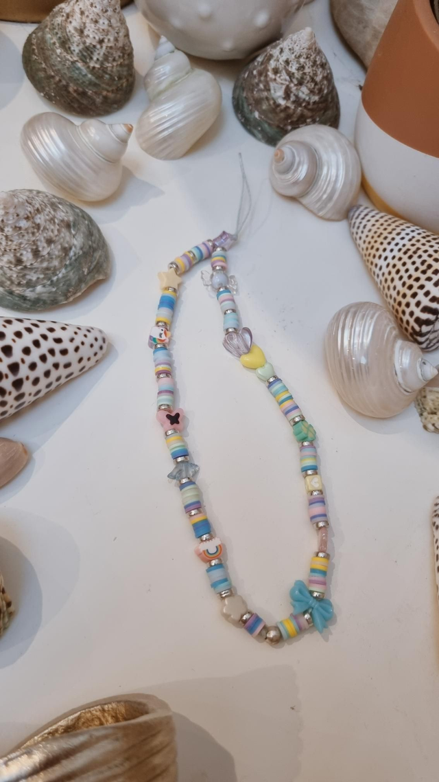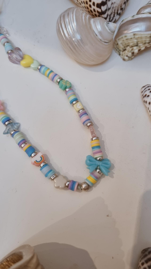 Composée de perles en argile polymère et d’éléments décoratifs fantaisie (personnages, fleurs, arcs-en-ciel, formes diverses).