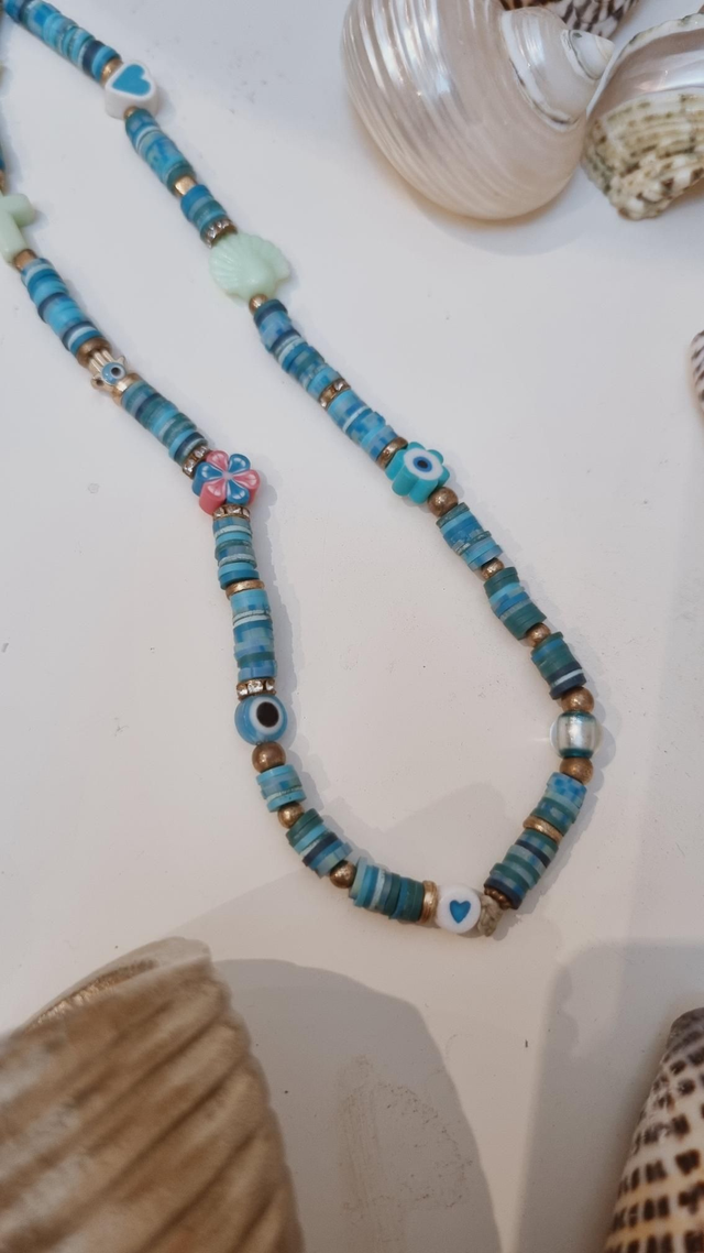 Composée de perles en argile polymère et d’éléments décoratifs fantaisie (personnages, fleurs, arcs-en-ciel, formes diverses).
