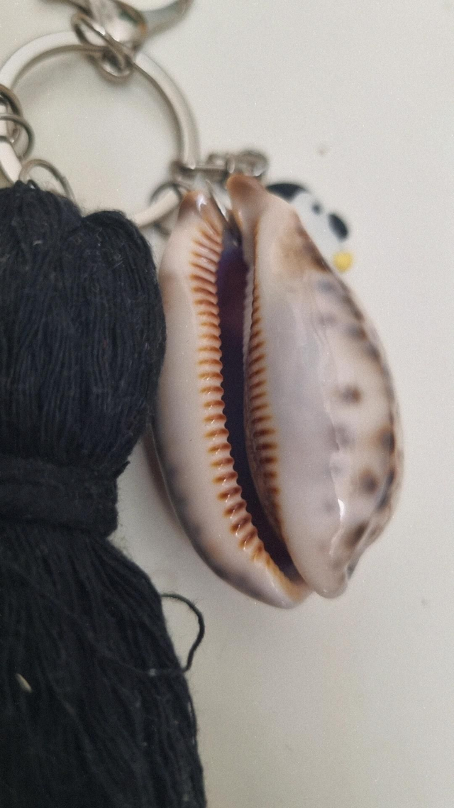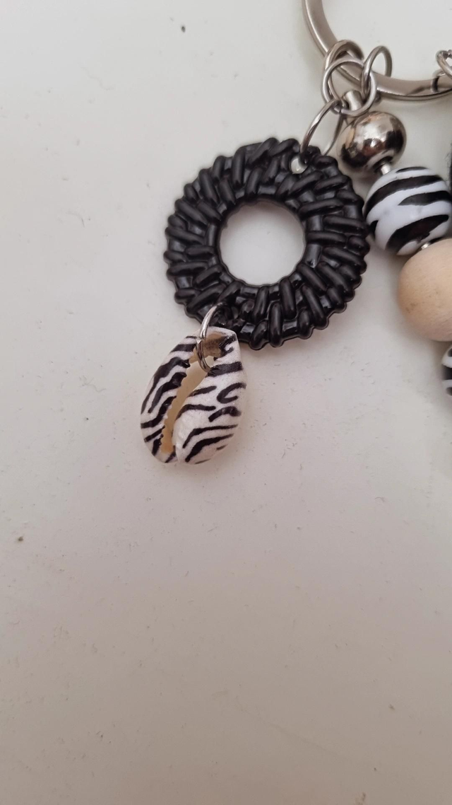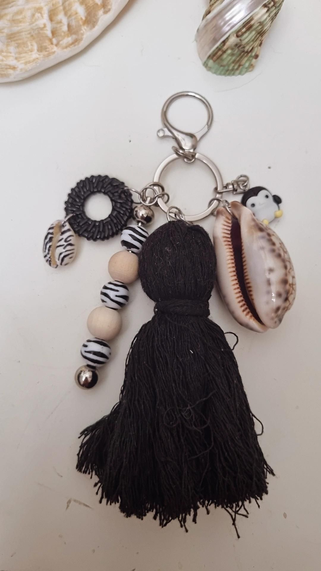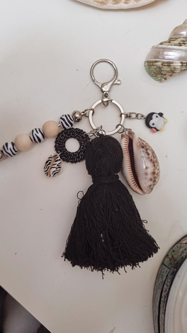 Ce porte-clé au style bohème associe coquillages, perles et détails en coton/macramé pour un rendu naturel et élégant.