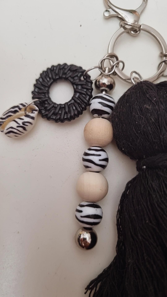 Chaque pièce est faite main et unique. Son mousqueton, doré ou argenté selon le modèle, permet de l’utiliser comme porte-clé, bijou de sac, grigri décoratif ou décoration de rétroviseur.
