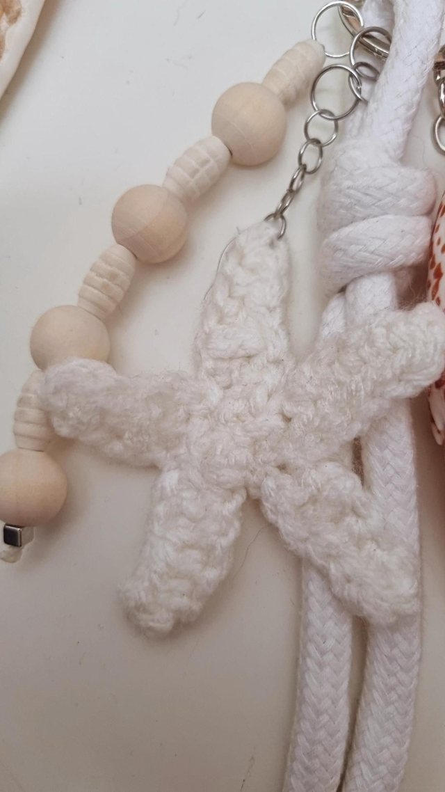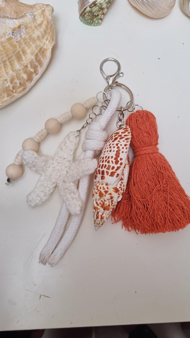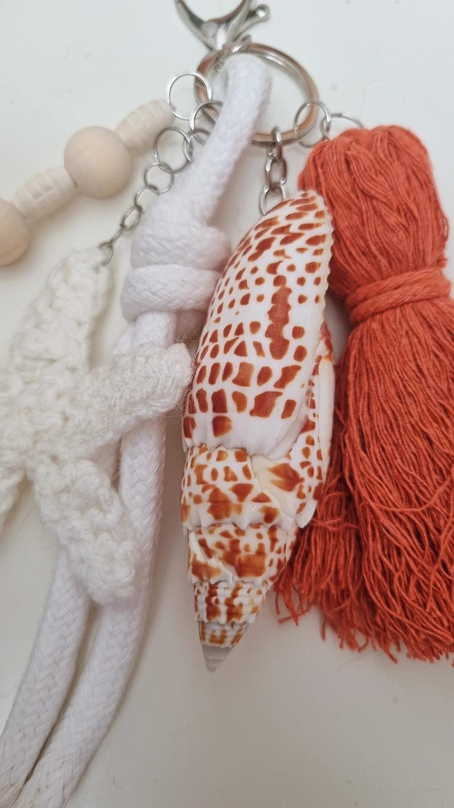 Ce porte-clé au style bohème associe coquillages, perles et détails en coton/macramé pour un rendu naturel et élégant.