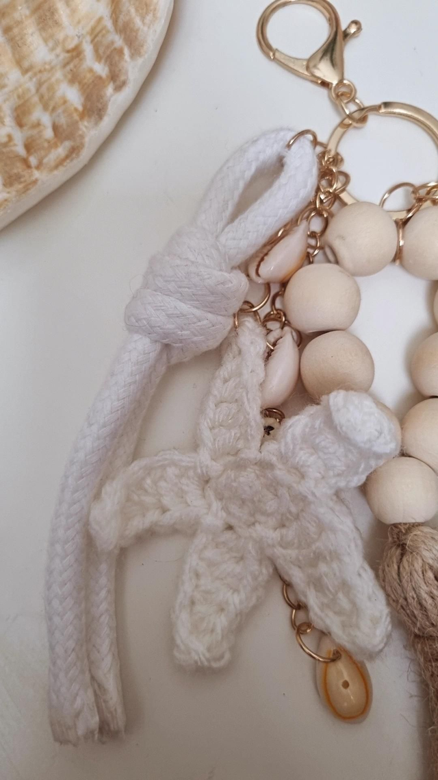 Ce porte-clé au style bohème associe coquillages, perles et détails en coton/macramé pour un rendu naturel et élégant.