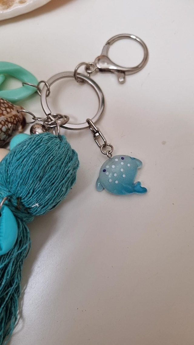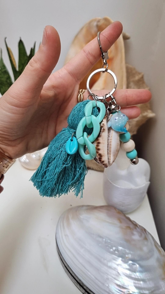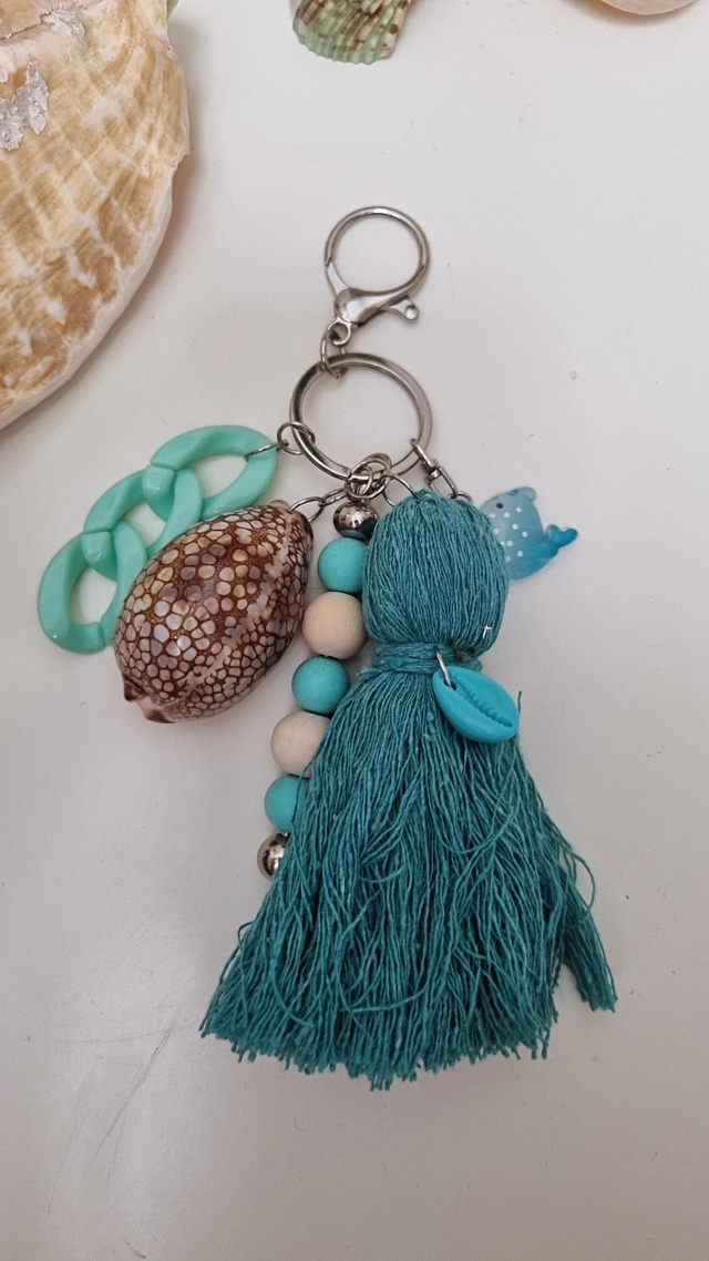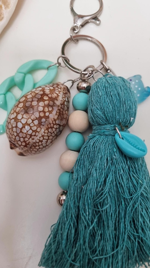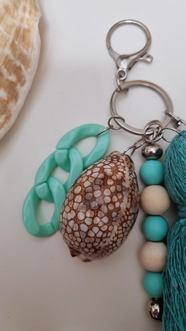 Ce porte-clé au style bohème associe coquillages, perles et détails en coton/macramé pour un rendu naturel et élégant.