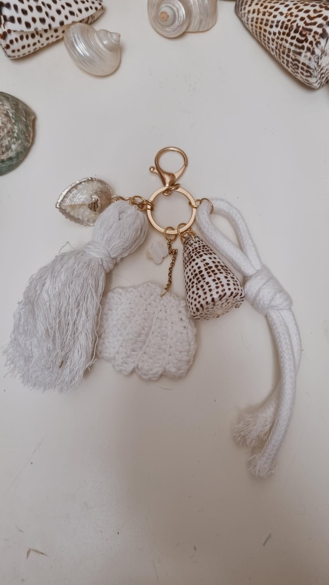Ce porte-clé au style bohème associe coquillages, perles et détails en coton/macramé pour un rendu naturel et élégant.