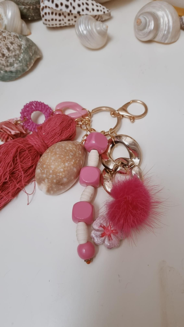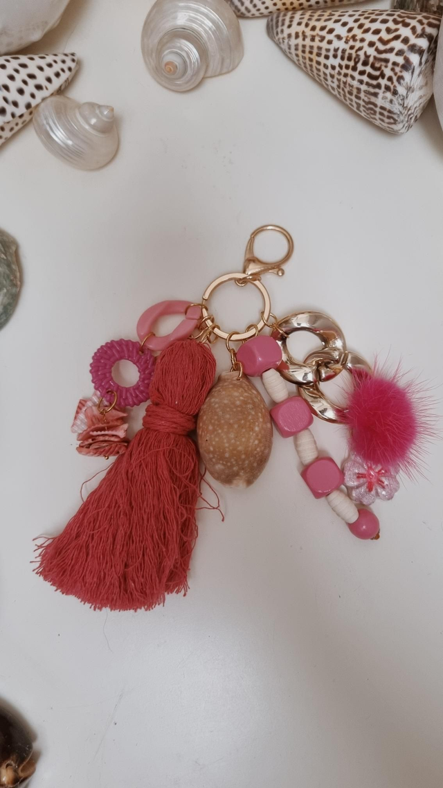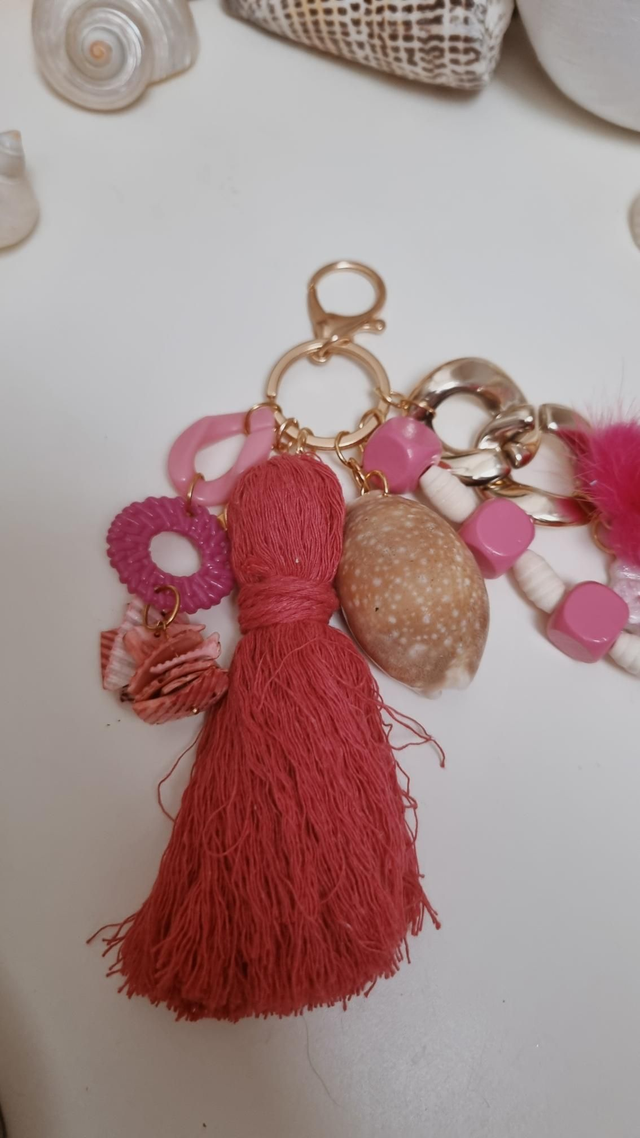 Ce porte-clé au style bohème associe coquillages, perles et détails en coton/macramé pour un rendu naturel et élégant.